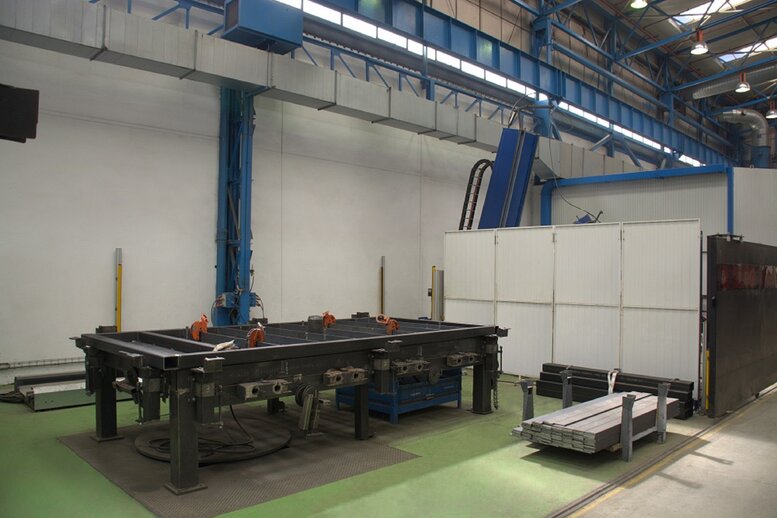 - This cell is also composed of a longitudinal track with an effective run of 10,600 mm and a tilted column to elevate the robot to different heights while being able to approach the part and the different welding points, both internal and externally.